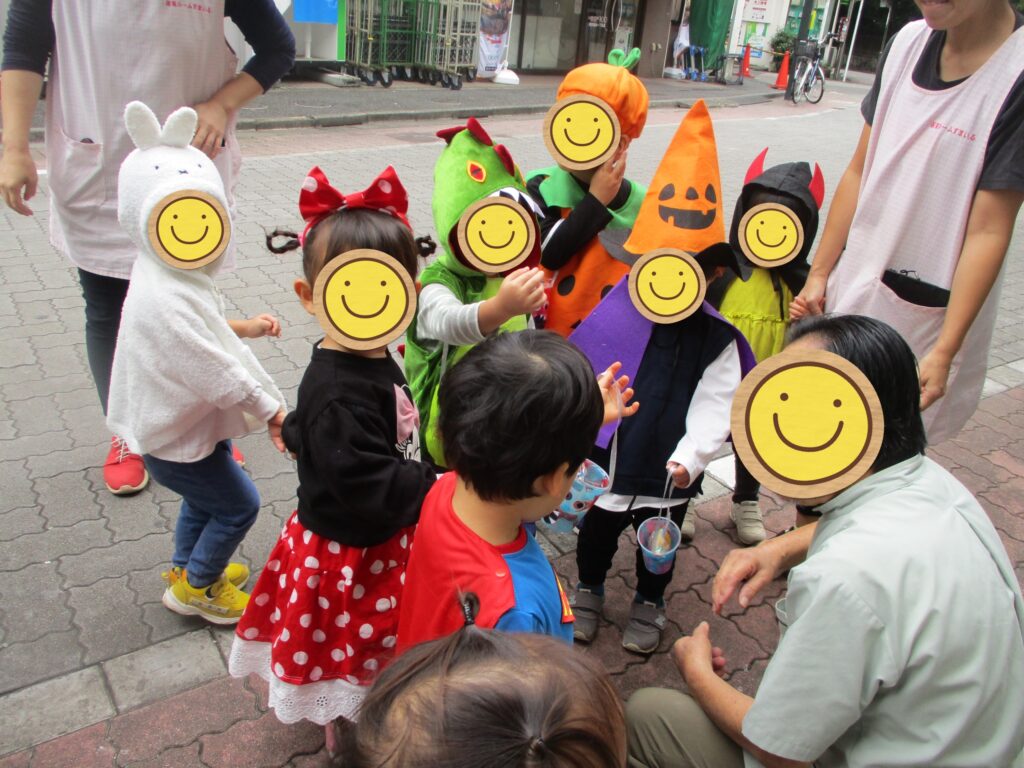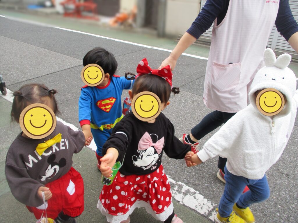 また、いつもと違う服装にワクワクの子どもたちは、登園してきたお友だちのパパママにも「みて〜」と仮装を披露し、園内はいつも以上の笑顔で溢れていました😆✨